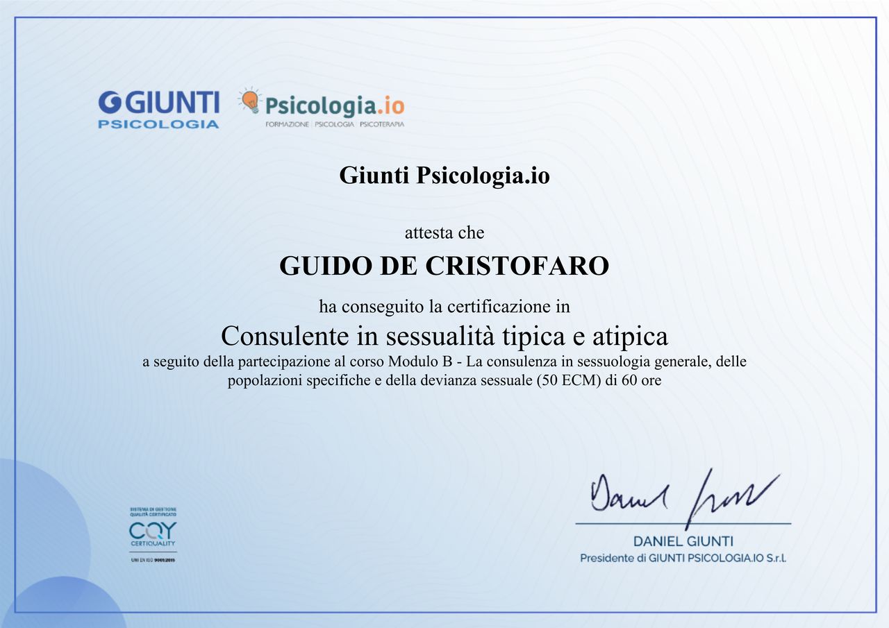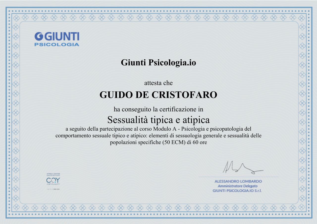 Salve, sono Guido de Cristofaro e sono uno Psicoterapeuta Sistemico Relazionale e Famigliare e Consulente in Sessuologia Tipica e Atipica.